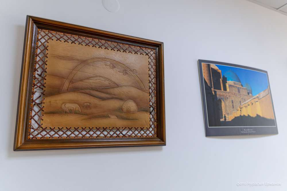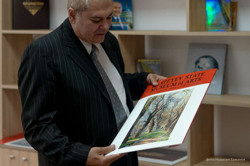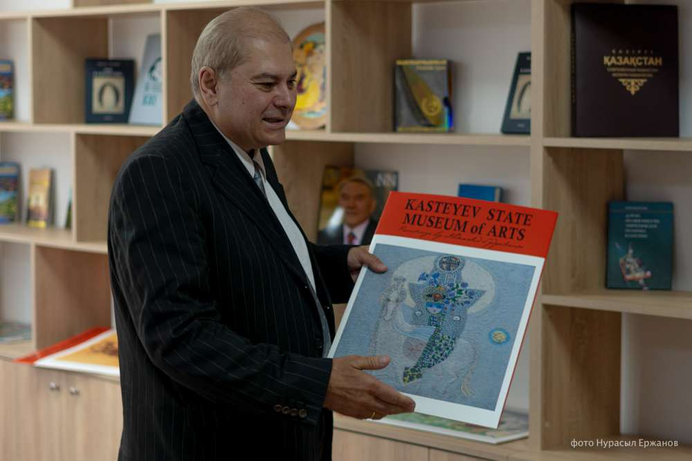 "Здесь мы видим репродукции разных прекрасных современных художников, которые не только представляют классическую культуру, здесь есть также реалистические картины, казахстанские пейзажисты, портретисты", — рассказал грузинский профессор.