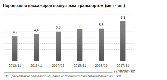 «В общей сложности казахстанские авиакомпании перевезли 6,8 млн человек, это на 1,3 млн человек, или на 22,2% больше, чем было перевезено воздушным путем за январь-ноябрь 2016 года. Это самый существенный годовой рост объемов пассажироперевозок за последние пять лет», - говорится в сообщении.