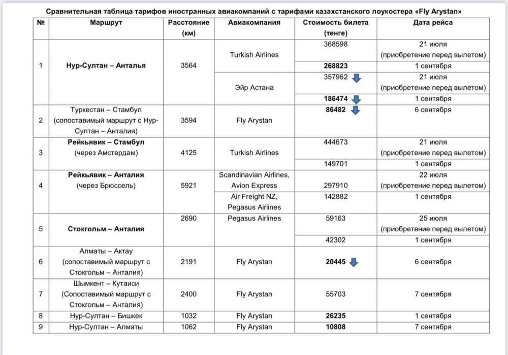 "Другой пример, маршрут Стокгольм – Анталия с расстоянием 2690 км на 1 сентября 2022 года тариф авиакомпании "Pegasus Airlines" составляет 42 302 тенге. К сравнению, тарифы казахстанского лоукостера "Fly Arystan" по маршруту Алматы – Актау (2191 км) и Шымкент – Кутаиси (2400 км) на начало сентября текущего года составляют 20 445 тенге и 55 703 тенге соответственно", - говорится в сообщении ведомства.