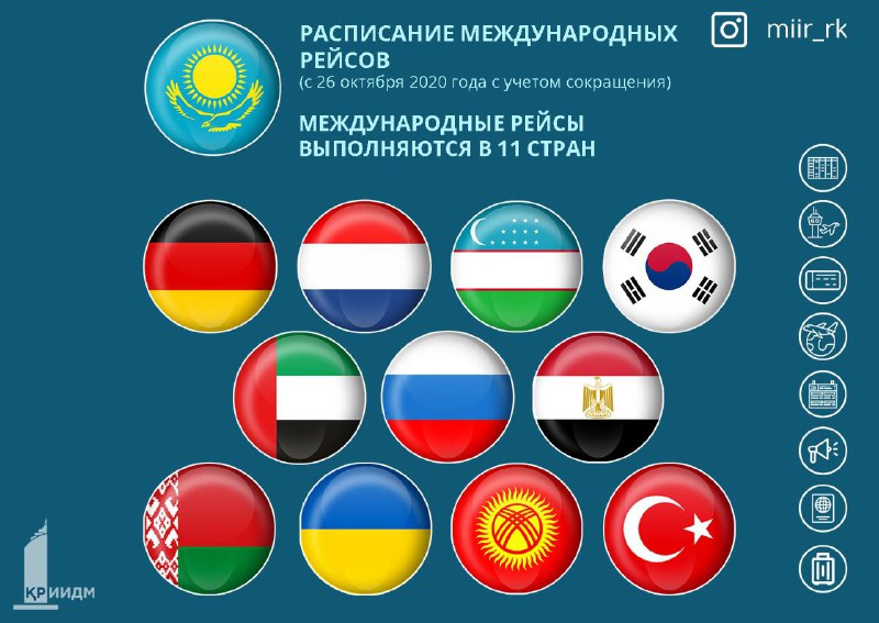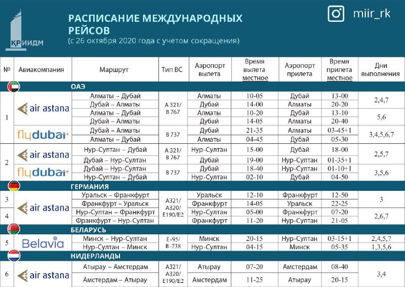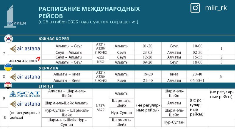 Министерство индустрии и инфраструктурного развития РК опубликовало новое расписание международных рейсов, передает