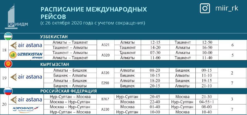 19) Алматы – Бишкек – Алматы (Эйр Астана – два раза в неделю);
