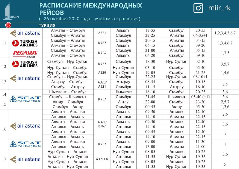 11) Алматы – Стамбул – Алматы (Эйр Астана – семь раз в неделю, Turkish Airlines – пять раз в неделю, Pegasus Airlines – три раза в неделю);