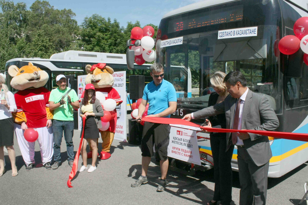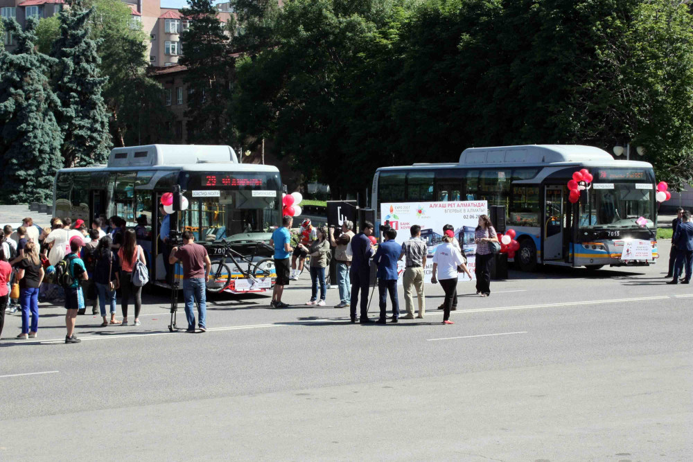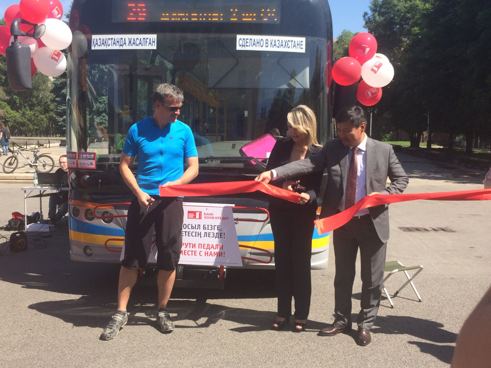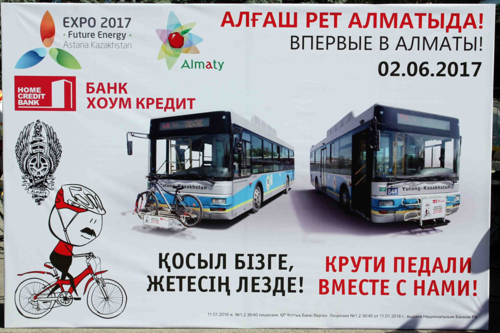 Специальные крепления на автобусах были разработаны для удобства перемещения с велосипедом на общественном транспорте по инициативе акимата г.Алматы и финансовой поддержке банка «Хоум Кредит». Их установили на фронтальную часть автобусов.