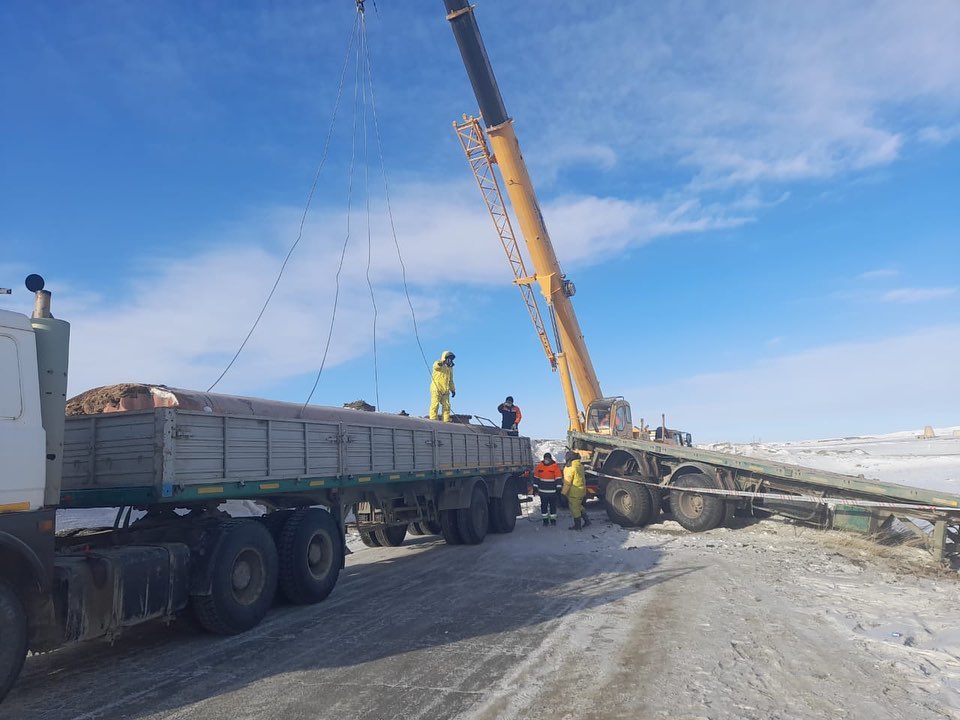 "По прибытии сотрудников установлено, что произошло опрокидывание грузовой автомашины марки MAZ, принадлежащей ТОО Sary-Arka Coppers Processing. В 30-тонной автоцистерне находилась серная кислота, которая в результате опрокидывания разлилась на открытой местности общей площадью 80 квадратных метров", − говорится в сообщении.