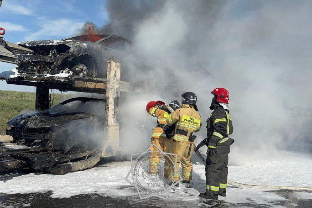 На автодороге "Карабутак – Кызылорда – Шымкент" в Кызылординской области произошло возгорание автовоза, перевозившего шесть легковых автомобилей. Инцидент вызвал тревогу у проезжавших водителей - пламя быстро охватило часть техники, передает BAQ.KZ.
