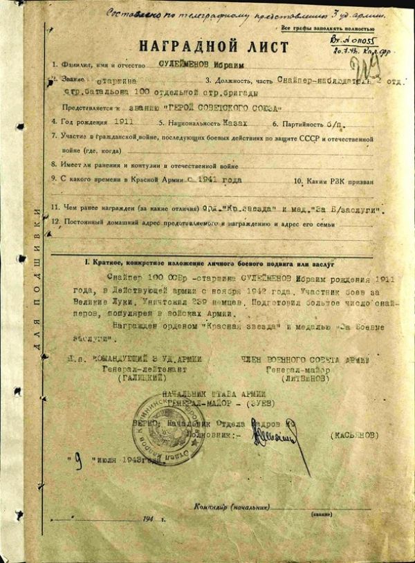 По словам Кул-Мухаммеда, обычно процесс представления к награде высокого статуса наподобие звания Героя Советского Союза, как правило, сопровождается подробнейшим досье на кандидата, в котором тщательно перечисляются и детально описываются все заслуги и деяния этого человека начиная с первого дня его пребывания на фронте. Что же касается Ибраима Сулейменова, то в двухстраничном формуляре характеристика его боевого пути, увы, оказалась втиснутой в один-единственный абзац: "Снайпер … старшина Сулейменов Ибраим рождения 1911 года, в Действующей армии с ноября 1942 года. Участник боев за Великие Луки. Уничтожил 239 немцев. Подготовил большое число снайперов, популярен в войсках Армии. Награжден орденом "Красная Звезда" и медалью "За боевые заслуги".