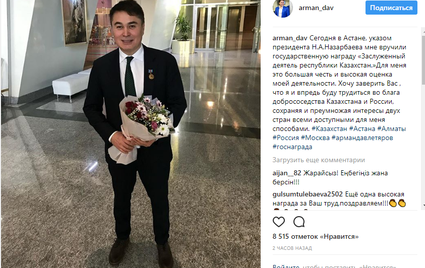 «Сегодня в Астане указом президента Нурсултана Назарбаева мне вручили государственную награду «Заслуженный деятель республики Казахстан». Для меня это большая честь и высокая оценка моей деятельности. Хочу заверить Вас, что я впредь буду трудиться во благо добрососедства Казахстана и России, сохраняя и приумножая интересы двух стран всеми доступными для меня способами», - написал на своей страничке в Instagram Давлетяров.