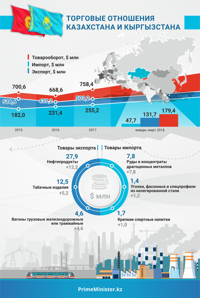 Справочно: В прошлом году товарооборот между РК и КР вырос на 13,4% по сравнению с аналогичным периодом 2016 года (2017 — 758,4 млн долларов, 2016 — 668,6 млн долларов), при этом экспорт из Казахстана вырос на 15,1% и составил 503,2 млн долларов. По итогам I квартала текущего года данный тренд сохранился, и рост составил 16,6% (товарооборот в январе–марте 2018 г. — 179,4 млн долларов). Экспорт из РК в КР за январь–март вырос на 27,9% и составил 131,7 млн долларов.