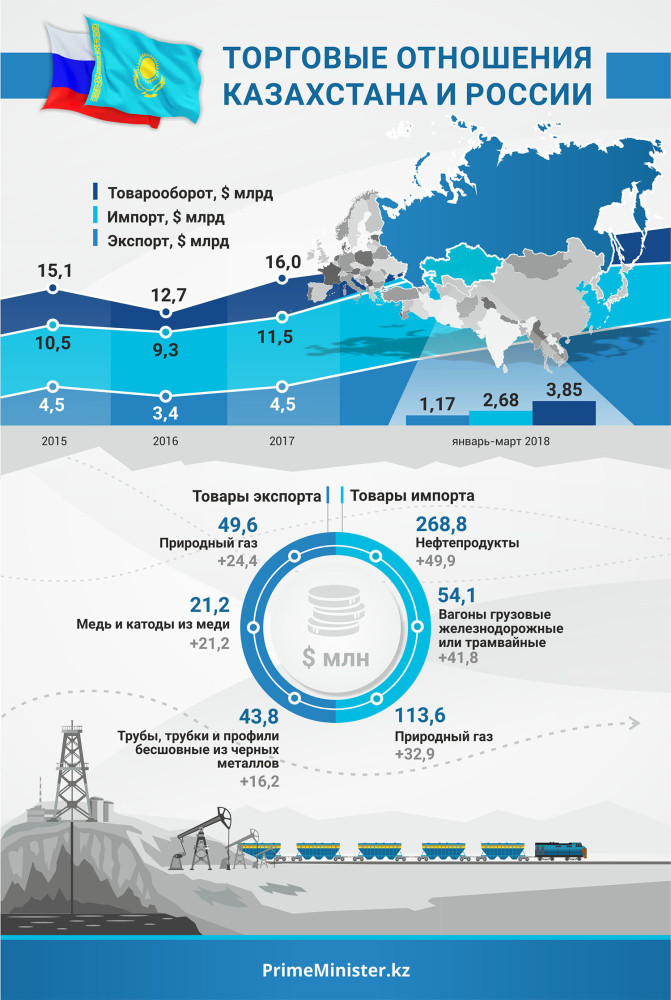 Справочно: В прошлом году товарооборот между Казахстаном и Россией увеличился по сравнению с 2016 годом на 25,6% (16 млрд долларов). Экспорт вырос на 31,1% и составил 4,5 млрд долларов (2016 — 3,5 млрд долларов). За январь–март 2018 года товарооборот составил 3,9 млрд долларов, что на 8,3% выше, чем за аналогичный период предыдущего года (3,6 млрд долларов), при этом экспорт из РК в РФ вырос на 7,3% и составил 1,2 млрд долларов.