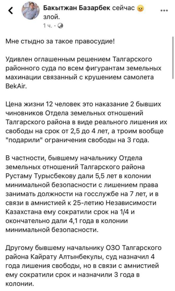 Эксперт в области земельного права Бакытжан Базарбек возмутился решением Талгарского районного суда Алматинской области по всем фигурантам земельных махинации, связанные с крушением самолета Bek Air. Об этом, как передает BaigeNews.kz, он написал на своей странице в Facebook.