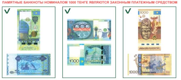 При этом Нацбанк информирует, что в обращении находятся памятные банкноты номиналом 1000 тенге, которые являются законным платежным средством.