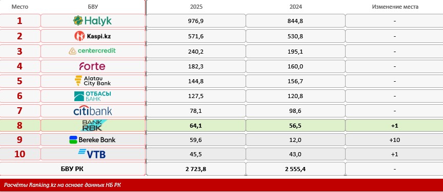 Десятое место занял Банк ВТБ Казахстан, который улучшил свою позицию на одну строчку. Его прибыль выросла с 43 млрд тенге до 45,5 млрд тенге, что соответствует росту на 5,9%.
