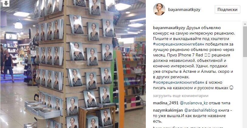 «Друзья, объявляю конкурс на самую интересную рецензию. Пишите и выкладывайте под хэштегом #моярецензияокнигебаян. Победителя за лучшую рецензию объявлю ровно через месяц. Приз - IPhone 7 Red. Рецензия должна быть независимой, объективной и, конечно, интересной. Удачи! Продажи уже открыты в Астане и Алматы. Скоро и в других регионах. #моярецензияокнигебаян можно писать на казахском и русском языках», - написала Баян Максаткызы.
