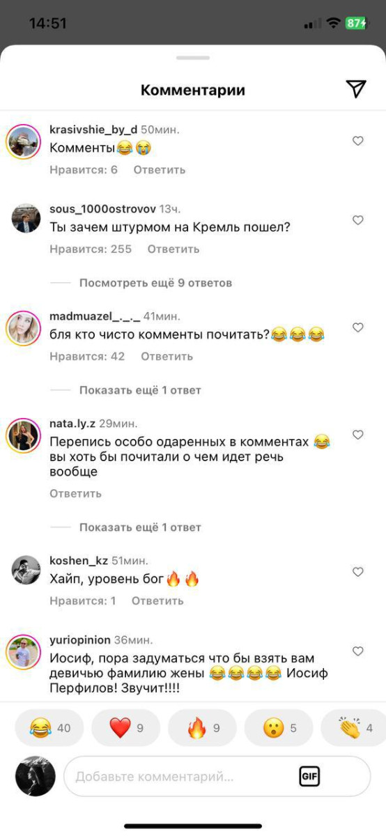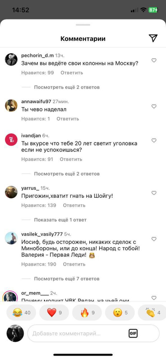 Заглянув в свой Instagram, Иосиф Пригожин увидел тысячи комментариев, в которых его просят "вернуть Ростов-на-Дону" и перестать "гнать на Шойгу", а некоторые вообще советуют Пригожину взять фамилию жены — певицы Валерии.