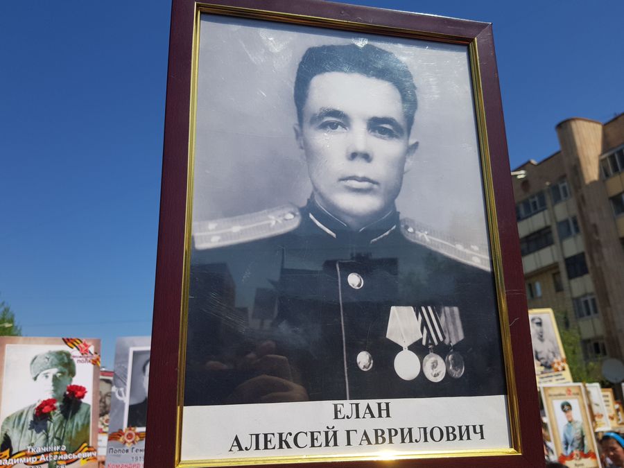 Памяти участника Сталинградской битвы Алексея Елана несёт портрет его племянник Олег. Алексей ушёл на фронт 17-летним, приписав себе год. Победу встретил в Венгрии, а после служил ещё в Армении. Отец же Олега трудился в тылу, ремонтируя бронепоезда в Новочеркасске.