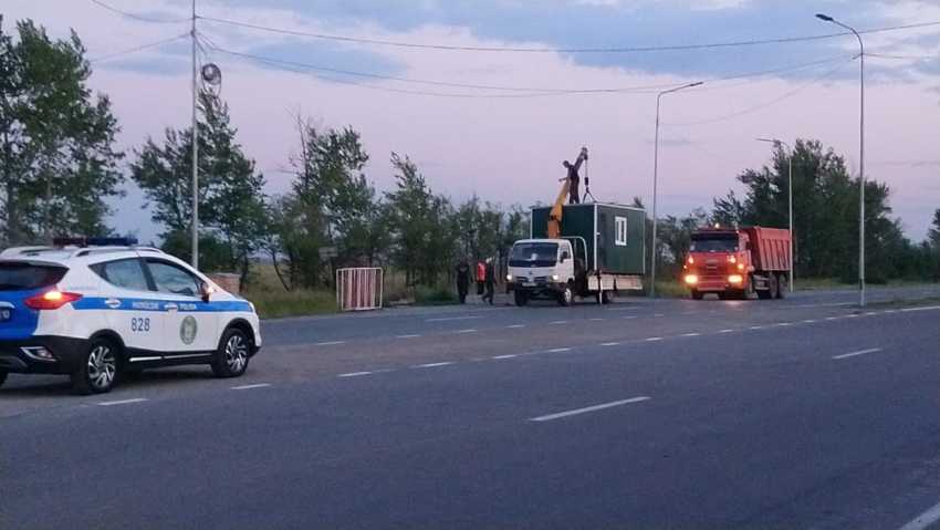 На кадрах видно, как на трассе Костанай-Рудный привезли бетонные плиты и вагончик.