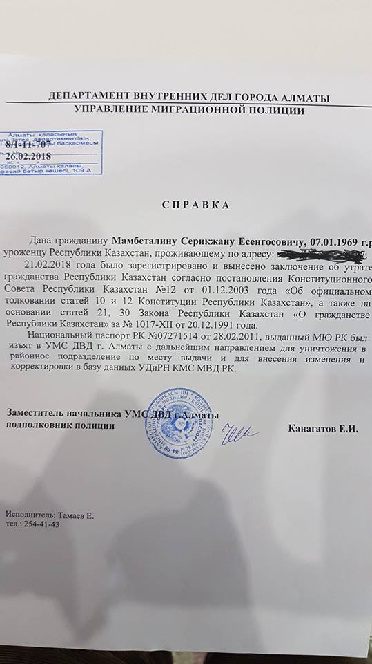 Предприниматель и экс-председатель партии "Руханият" Серикжан Мамбеталин на своей странице в Facebook выложил фотографию справки, которая подтверждает утрату им гражданства Казахстана, сообщает BNews.kz.
