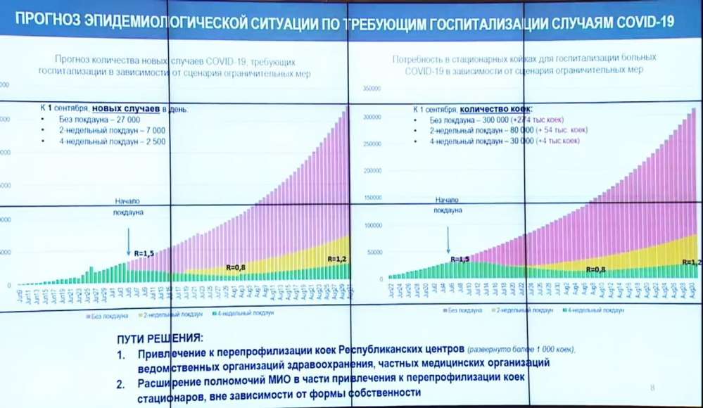 "Тогда на конец августа будут регистрироваться 2 500 случаев в день, требующих госпитализации, и потребность в койках возрастет до 30 тысяч, что в целом соответствует текущей ситуации. При этом, данный прогноз считаем наиболее эффективным с точки зрения существования разрыва цепи заражения среди населения, а также подготовки соответствующей инфраструктуры", – подчеркнул глава Минздрава.