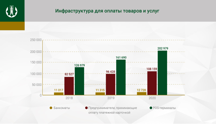 "По сравнению с показателями 2019 года наблюдается рост количества торговых точек, принимающих оплату платежной карточкой (на 26 процентов) и POS-терминалов (на 26 процентов). К концу 2020 года 86 процентов POS-терминалов на рынке поддерживали функцию бесконтактной оплаты", - отмечают в Нацбанке.
