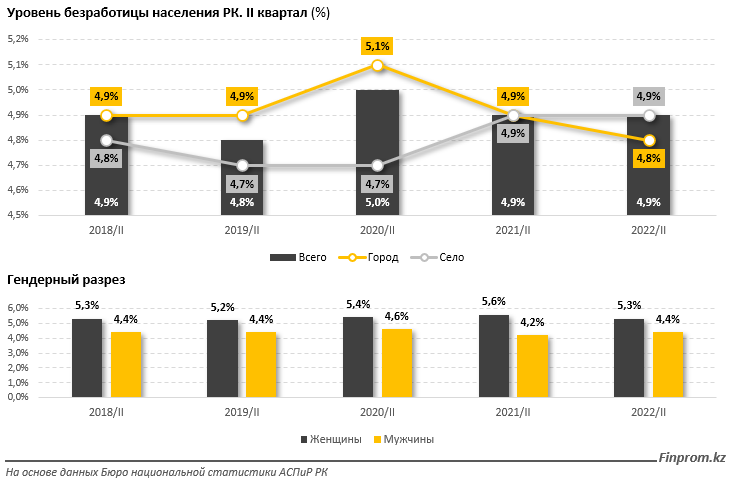 Уровень безработицы населения в РК остался прежним, составив во втором квартале 2022 года 4,9 процента. При этом в сельской местности показатель по сравнению с прошлым годом также не изменился, а в городской местности пошёл на спад.