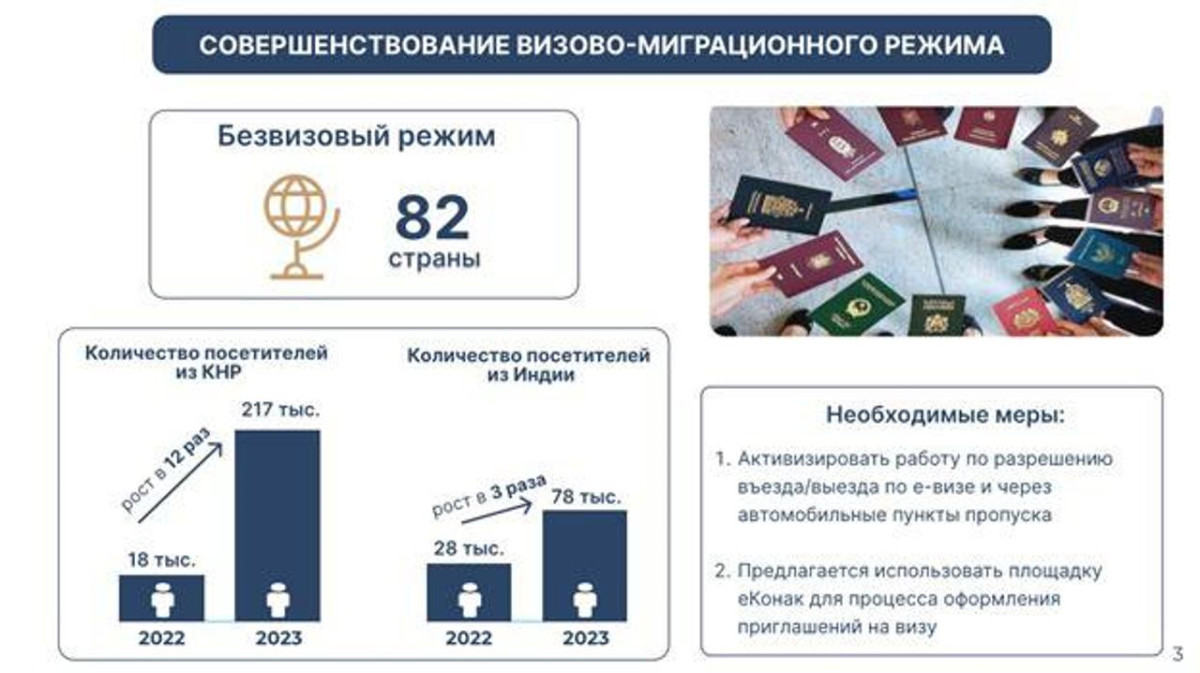 Благодаря введению 14-дневного безвизового режима для граждан Китая в июле 2022 года и взаимному безвизовому режиму с ноября 2023 года, количество посетителей из этой страны увеличилось в 12 раз с 18 тысяч до 217 тысяч. После введения 14-дневного безвизового режима, отмечается троекратный рост посетителей из Индии: с 28 тысяч человек в 2022 году до 78 тысяч человек в 2023 году.