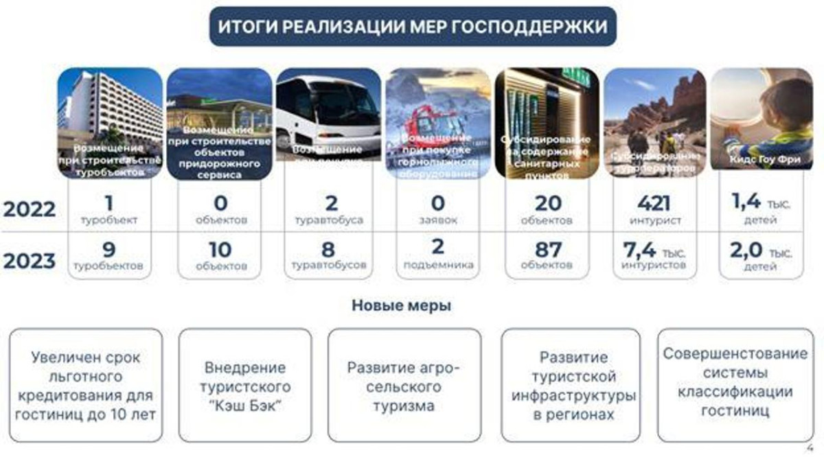 Для дальнейшего стимулирования массового туризма министерство прорабатывает вопрос о внедрении туристского кэшбека до 20 процентов от стоимости тура в низкий сезон. Кроме того, инициировано предложение по разрешению фермерам заниматься агротуризмом на своих землях. Принятие такой меры будет способствовать повышению уровня благосостояния сельских территорий путем обеспечения дополнительной занятости более 10 тысяч сельских жителей. Это в особенности актуально в регионах восточного и южного Казахстана.