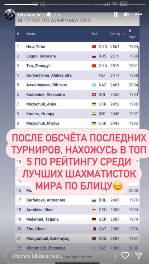 Двукратная чемпионка мира по блицу, 19-летняя Бибисара Асаубаева в социальных сетях рассказала о том, что улучшила свою позицию в мировом рейтинге, передаёт BaigeNews.kz.