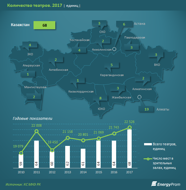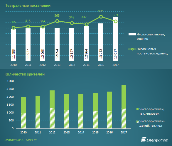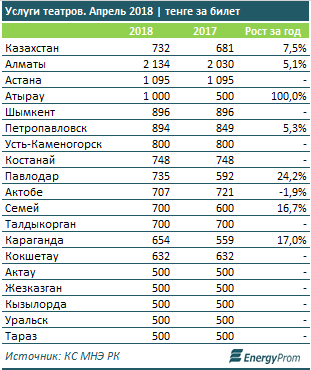В стране работает 68 театров, из которых 25 – в Алматы и Астане. Самые дорогие билеты оказались в Алматы (2134 тенге, +5,1% за год), Астаны (1095 тенге) и Атырау (1000 тенге - вдвое дороже, чем год назад).