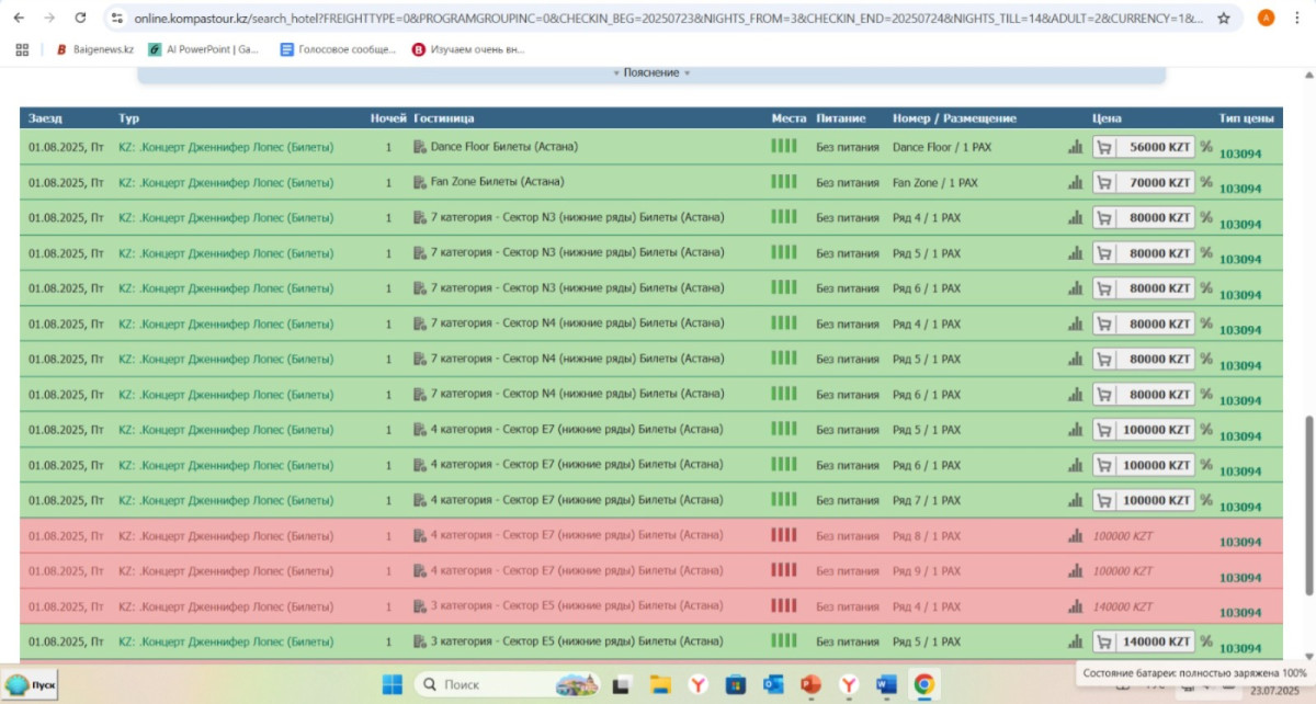 Редакция проверила сайт официального туроператора Kompastour.kz и подтвердила наличие онлайн-туров, в которых билеты на концерт Джей Ло предлагаются со значительными скидками. Например, фан-зона, стоившая 128 400 тенге, теперь продаётся по 70 000 тенге.