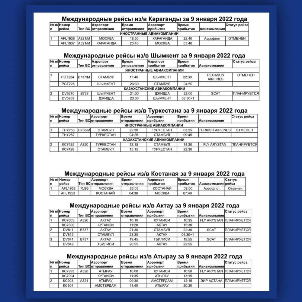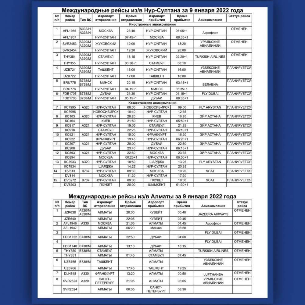 По международным рейсам проинформировало Министерство индустрии и инфраструктурного развития. 9 января 2022 года из/в Нур-Султан планируется выполнение 24 международных рейсов в/из Ташкент, Минск, Дубай, Новосибирск, Киев, Стамбул, Франкфурт, Москва, Шарджа, Пхукет и отменено выполнение 6 рейсов в/из гг. Москва, Жуковский, Стамбул.