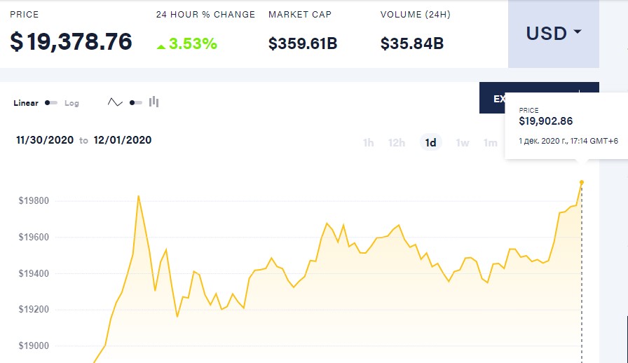 По состоянию на 17 часов 14 минут 1-го декабря 2020 года, как следует из графика CoinDesk, к моменту публикации новости криптовалюта торгуется на уровне 19,9 тысячи долларов за один биткоин.