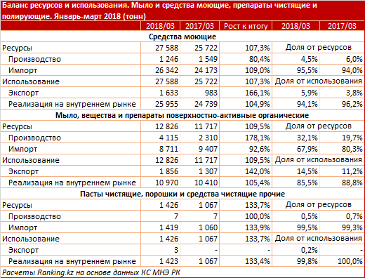 С мылом ситуация значительно лучше: производство в I квартале выросло сразу на 78,1% год-к-году, это уже 32,1% спроса против 19,7% годом ранее.