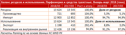 Парфюмерия и туалетные средства в РК также практически не производятся: собственного выпуска хватает, чтобы перекрыть лишь 5,3% спроса.