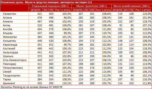 К лету за полукилограммовую упаковку стирального порошка казахстанцам пришлось платить уже 421 тенге - на 4,5% больше, чем годом ранее. Туалетное мыло обходилось в мае 2018 по 207 тенге за 100-граммовый кусок, это на 8,6% больше, чем год назад; хозяйственное мыло подорожало на 10% год-к-году, до 119 тг за 200-граммовый брикет.