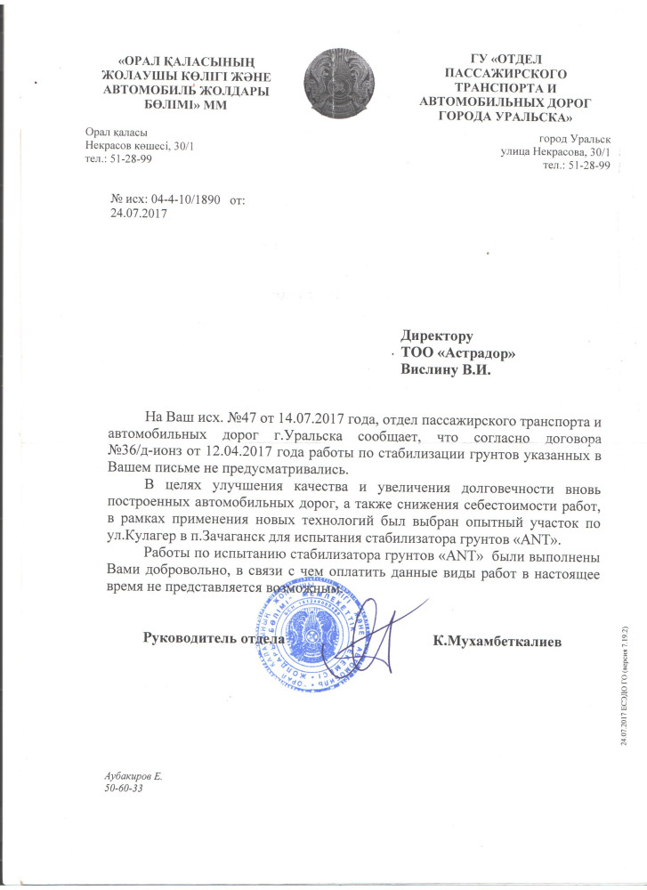 ТОО «Астрадор» выиграло тендер на проведение ямочного и щебеночно-гравийного ремонта 80 улиц Уральска в 2017 году. Стоимость подрядных работ составила 354 млн тенге, отметил руководитель компании Владимир Вислин. Он заявил, что к нему обратился руководитель отдела пассажирского транспорта и автомобильных дорог Уральска Кайрат Мухамбеткалиев и предложил отремонтировать опытный участок дороги с применением стабилизатора грунтов «ANT». Владимир Вислин утверждает, что передал 1 млн тенге на покупку дорогостоящего материала представителю компании «М-Проект Астана».