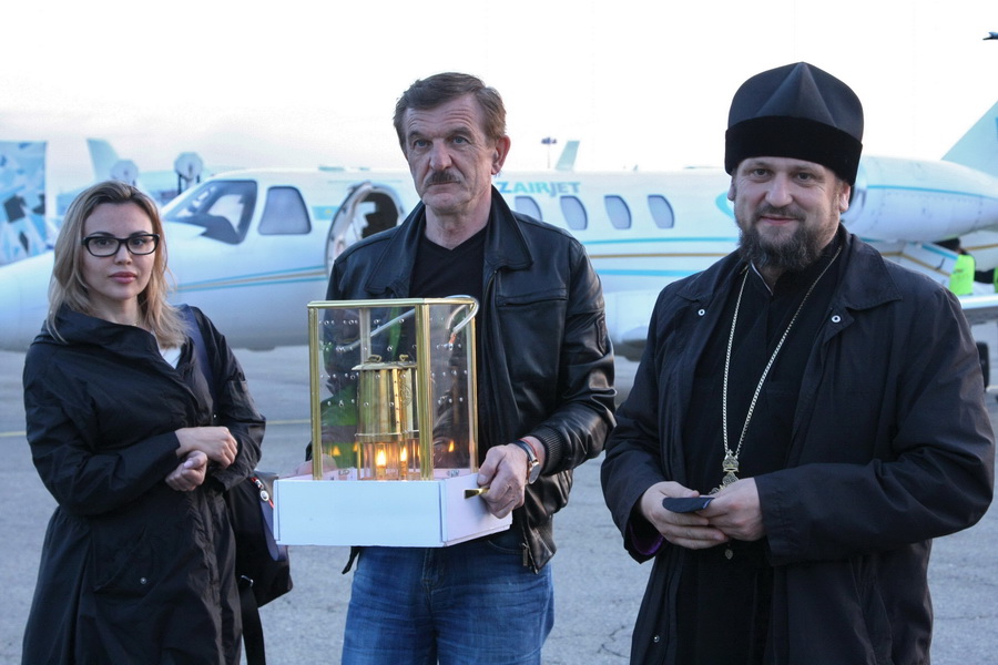 По пути из Тель-Авива семиместный бизнес-джет совершил посадку в Актау. Местные священнослужители поднялись на борт и приняли светильник, от которого впоследствии зажгут лампады и свечи в храмах Западного Казахстана. Затем самолет проследовал в столицу Нур-Султан, где в аэропорту его также встретили представители духовенства, чтобы получить светильники с частицей Благодатного огня.