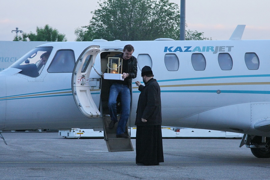 Частицы Благодатного огня перевозили в семи лампах-светильниках. Специальный рейс организовало одно из казахстанских туристических агентств.