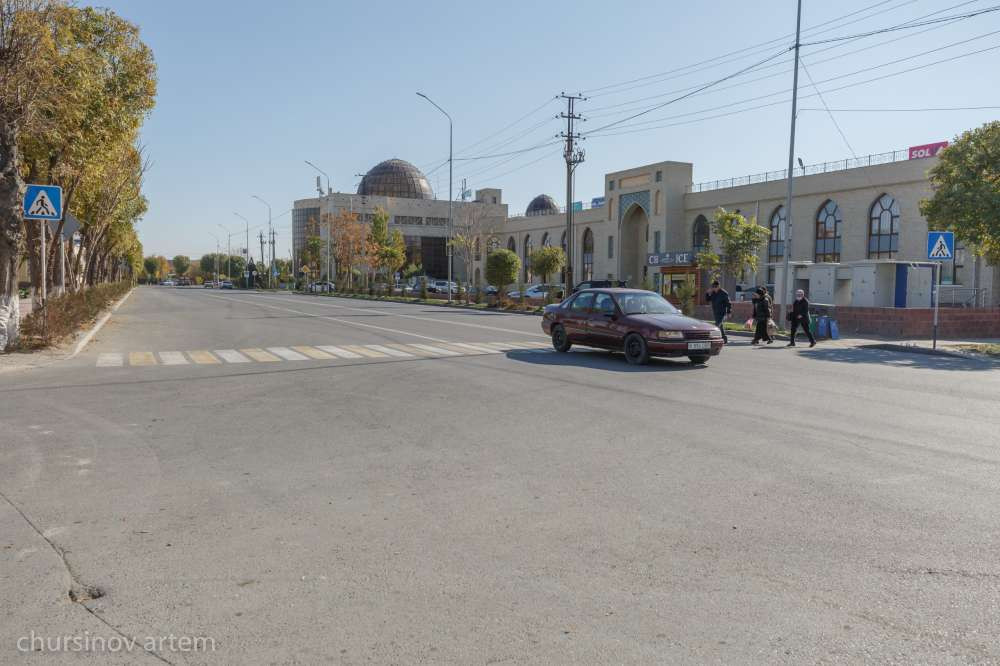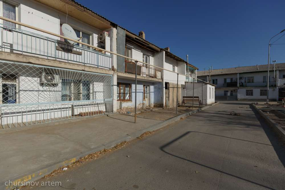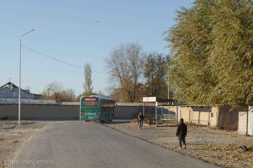 Из общего сельского пейзажа выделяются многоквартирные двухэтажные дома, которые когда-то строили для работников хлопкоперерабатывающего завода. То, что здесь все-таки город, а не село, выдает, пожалуй, и разъезжающий по району большой общественный автобус, с китайскими иероглифами, как напоминание о стране производства.