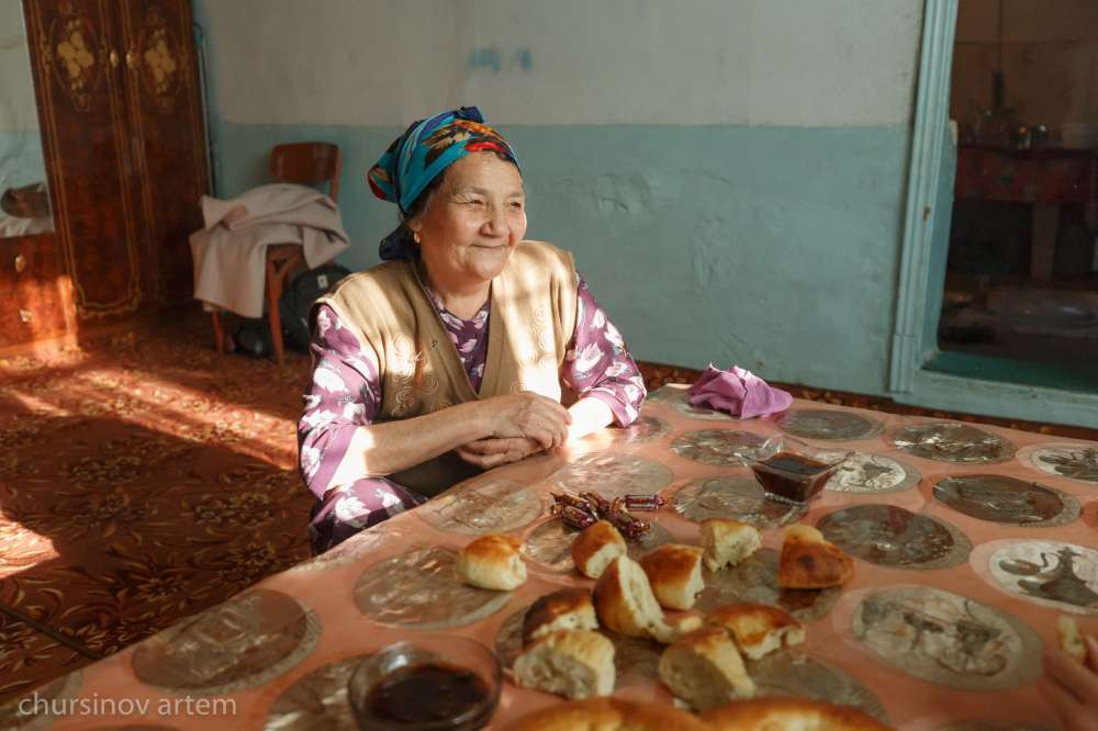 И тут впервые за все время нашей командировки мы столкнулись с настоящим южным душевным гостеприимством. В ходе беседы мы с фотографом не заметили, как оказались за дастарханом, на который хозяйка выложила все, что имелось дома. Мне даже пришлось пресечь попытки нашей чудесной собеседницы прорваться на кухню и приготовить нам свежее блюдо.
