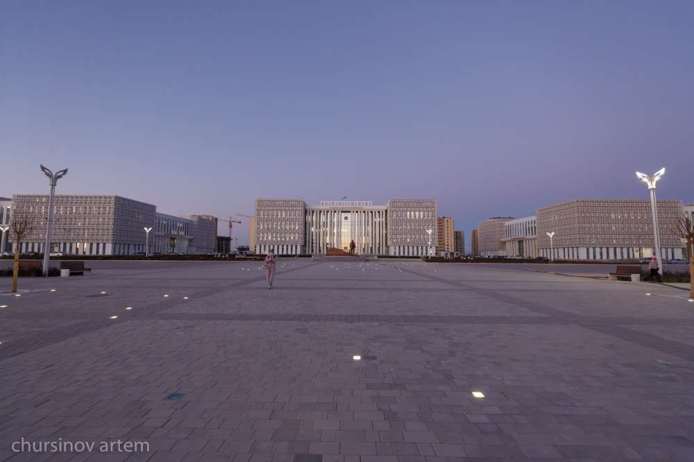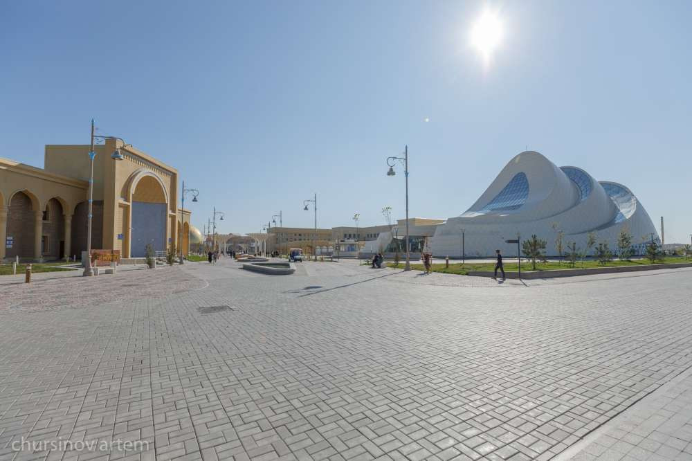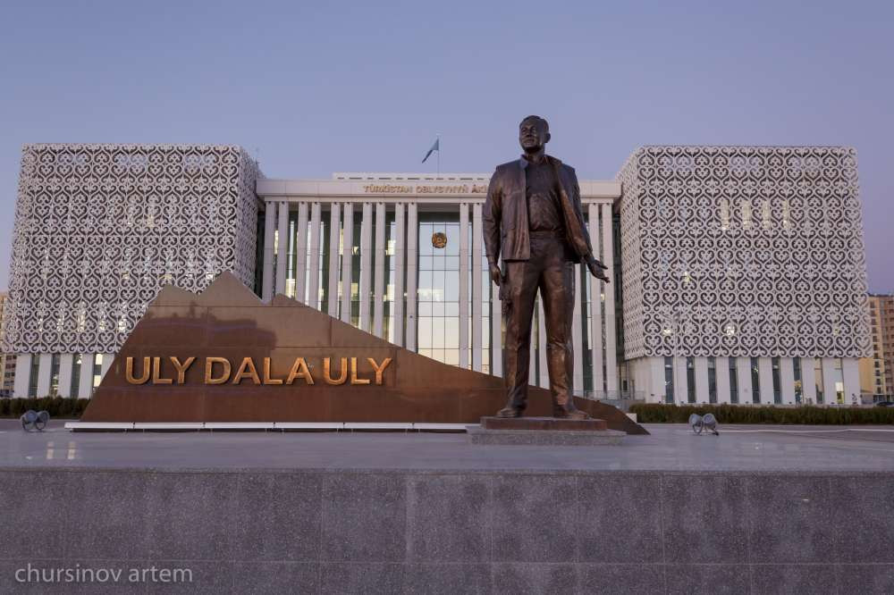 Это огромный административный городок, где располагается акимат Туркестанской области, дом управлений и много других госорганов. Этот район от "Хлопзавода" разделяет около 20 минут езды, но какая колоссальная между ними разница! Тут и современные здания с уютными современными офисами, Конгресс-холл, красивые дороги, тротуары и памятник Елбасы. С трудно узнаваемыми чертами, но все же.