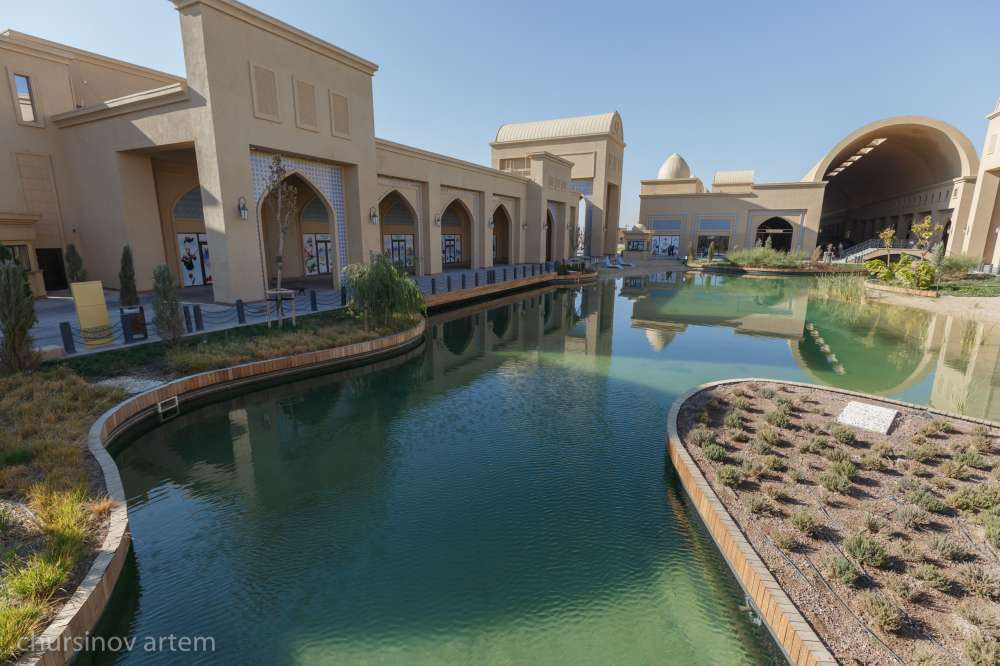 Первым делом после прилета наша съемочная группа (журналист и фотограф) поехала смотреть знаменитый туристический комплекс "Керуен-сарай". Тот самый, который прозвали "Туркестанской Венецией", который мелькал практически в каждом блогерском Инстаграме и начал рушиться, не успев достроиться, чем заслужил обидное прозвище "пенопластовый".