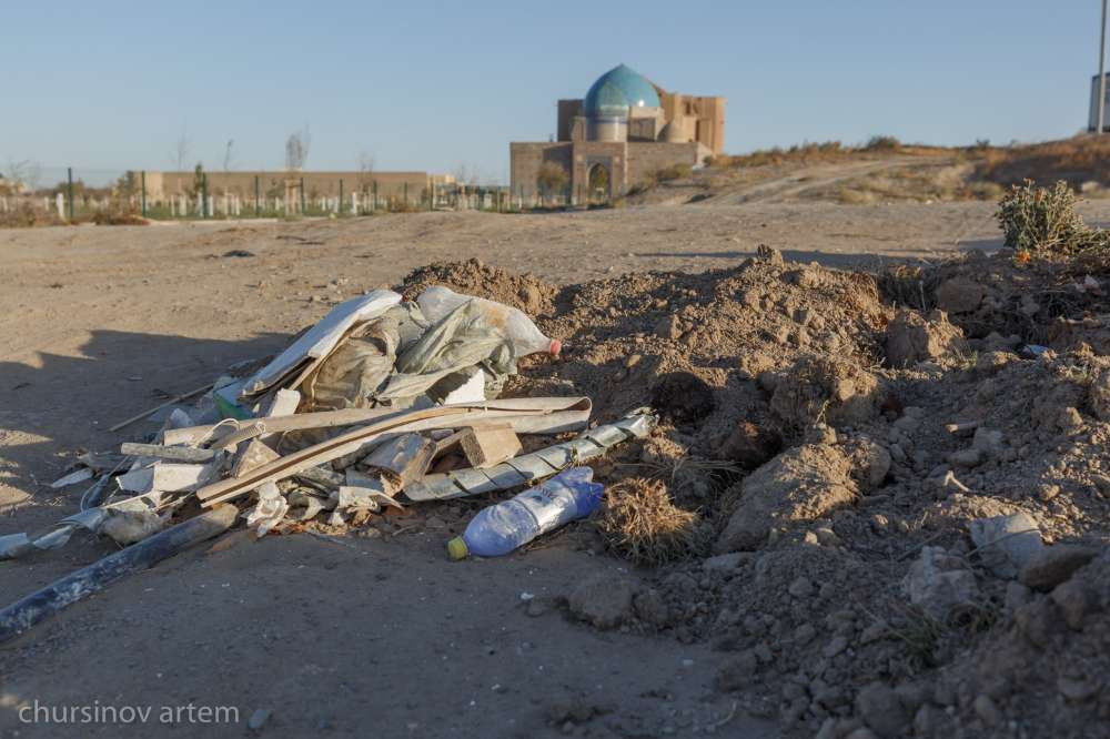 Вокруг мавзолея территорию облагородили, инфраструктура – приятная глазу, ничего лишнего. Но стоит отойти на несколько метров от святыни, то можно обнаружить большую свалку. Строительный мусор и пластик, видимо, достаточно долго лежали тут, поскольку местами вросли в землю.