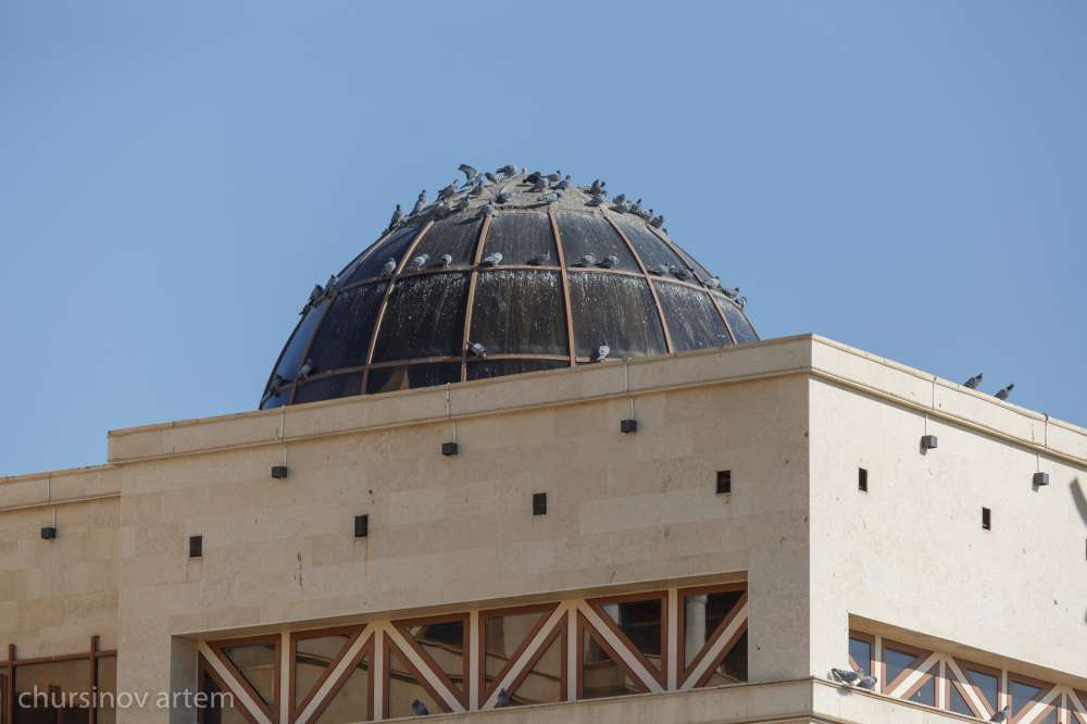 Недалеко от "Туркестанской Венеции" находится акимат города. Этому зданию тоже перепало критики от Варламова – он высмеял купола, которые голуби старательно пометили испражнениями. К нашему приезду, я была уверена, что вершину акимата уже почистили, но мы застали там и птиц, весьма вольготно чувствующих себя на крыше здания, и серую "шапочку", аккуратно облепившую главный купол городской администрации.