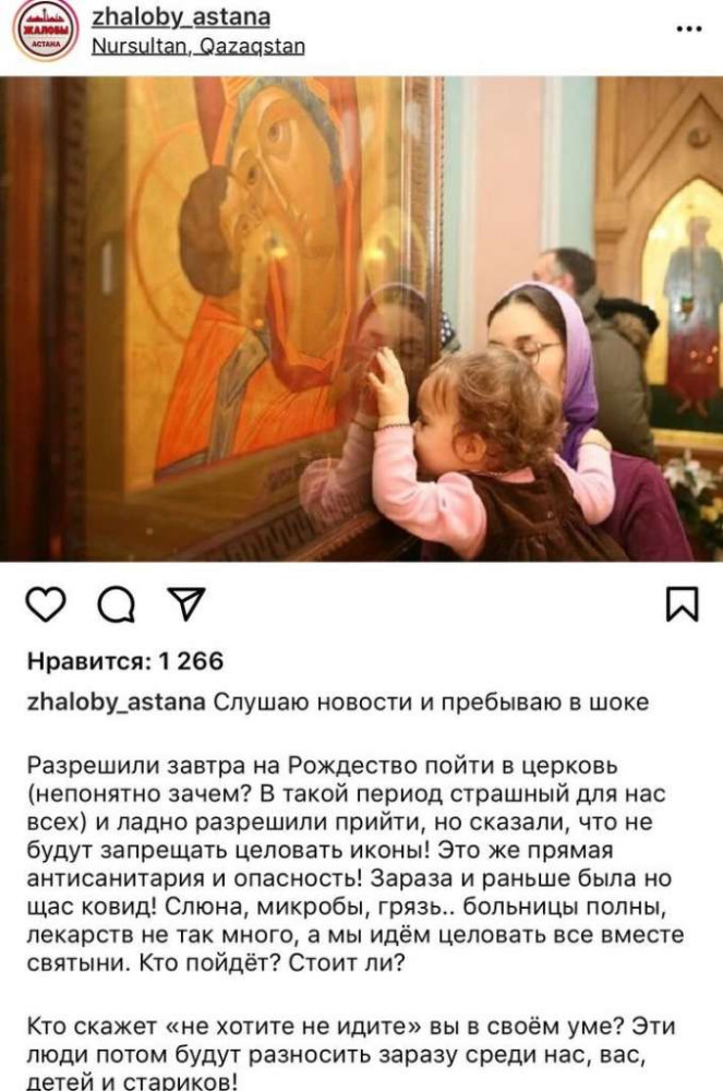 Кроме того, пользователи социальной сети распространяют информацию о том, что на Рождество в церквях не будут запрещать целовать иконы. Об этом сообщил Instagram-паблик "Zhaloby_astana".