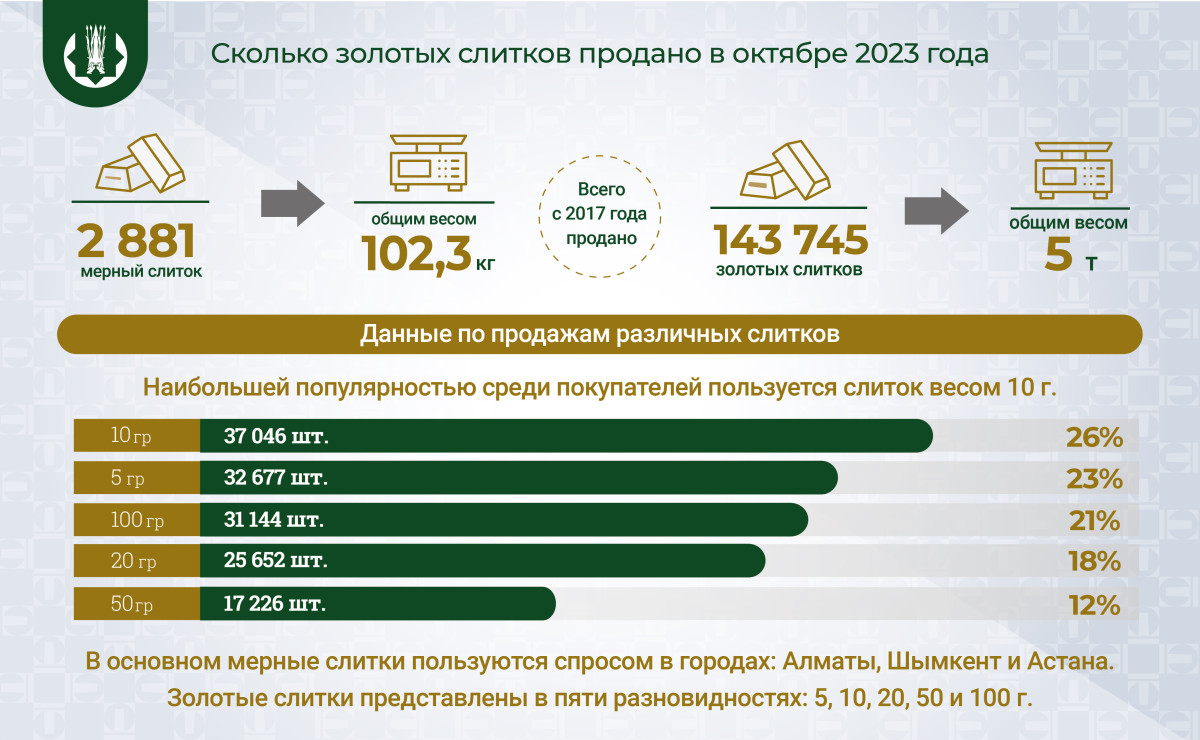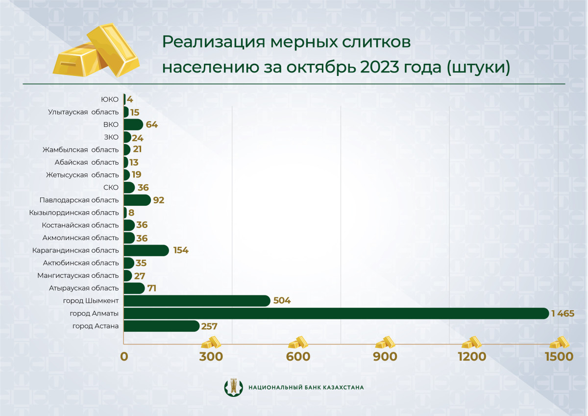 Больше всего слитков продано в Алматы (1 465 штук, 51 процент). Далее следуют Шымкент (504 штуки, 17 процентов) и Астана (257 штук, девять процентов).