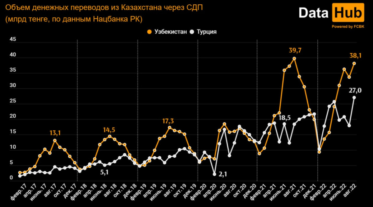 Близки к рекордным значениям и отправления в Узбекистан. В августе из Казахстана было переведено 38,1 миллиарда тенге. Больше было лишь однажды — в августе 2021г. (39,7 миллиарда тенге).