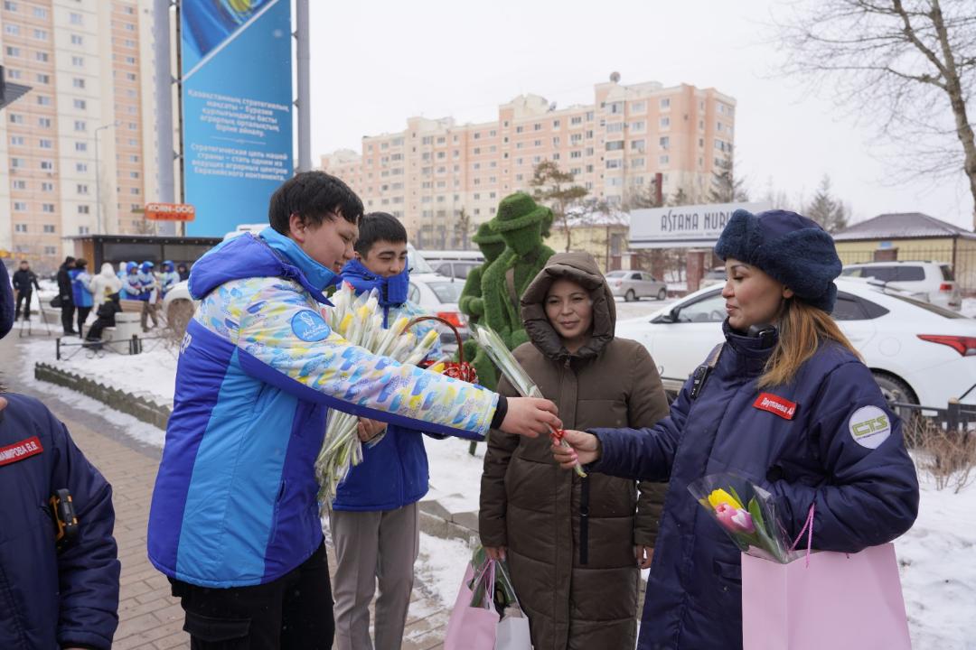 "Наша цель - подарить праздничное настроение представительницам прекрасной половины человечества. Хочется пожелать милым дамам счастья, здоровья и благополучия", - сказал один из волонтеров Ерасыл Амантай.