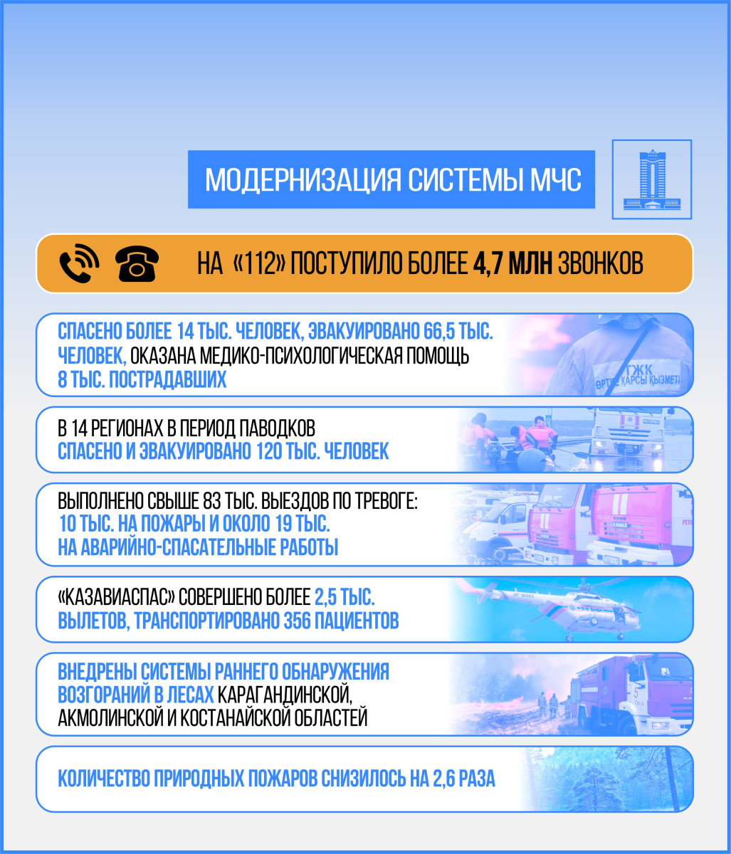 С 2024 года Казахстан продолжает улучшать систему реагирования на чрезвычайные ситуации. В этом году на пульт Единой дежурной диспетчерской службы "112" поступило более 4,7 млн звонков от населения. Силами МЧС было спасено более 14 тыс. человек, эвакуировано 66,5 тыс. человек, оказана медико-психологическая помощь 8 тыс. пострадавших. Также было совершено свыше 83,3 тыс. выездов по тревоге, в том числе 10 тыс. на пожары и около 19 тыс. на аварийно-спасательные работы.