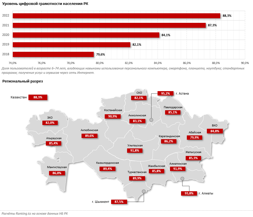 Аналитики отмечают, что население Казахстана уже готово к массовому использованию цифровых банковских услуг: уровень цифровой грамотности жителей страны достиг по итогам 2022 года 88,3 процента (в 2021 году он составлял 87,3 процента, в 2020-м — 84,1 процента, в 2019-м — 82,1 процента, в 2018-м — 79,6 процента). Это значение показывает долю пользователей в возрасте от шести до 74 лет, владеющих навыками использования персонального компьютера, смартфона, планшета, ноутбука; стандартных программ; получения услуг и сервисов через сеть Интернет.
