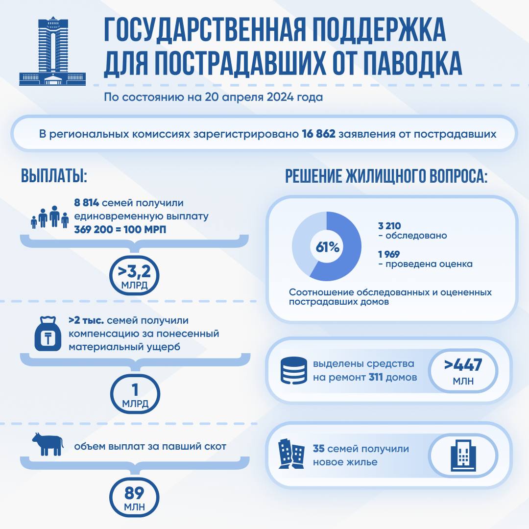 По состоянию на 20 апреля единовременную выплату в размере 100 МРП получили 8 814 семей на сумму около 3,2 млрд тенге. Более 2 тыс. семей получили компенсацию за понесенный материальный ущерб почти на 1 млрд тенге. Объем выплат за павший скот достиг 89 млн тенге.